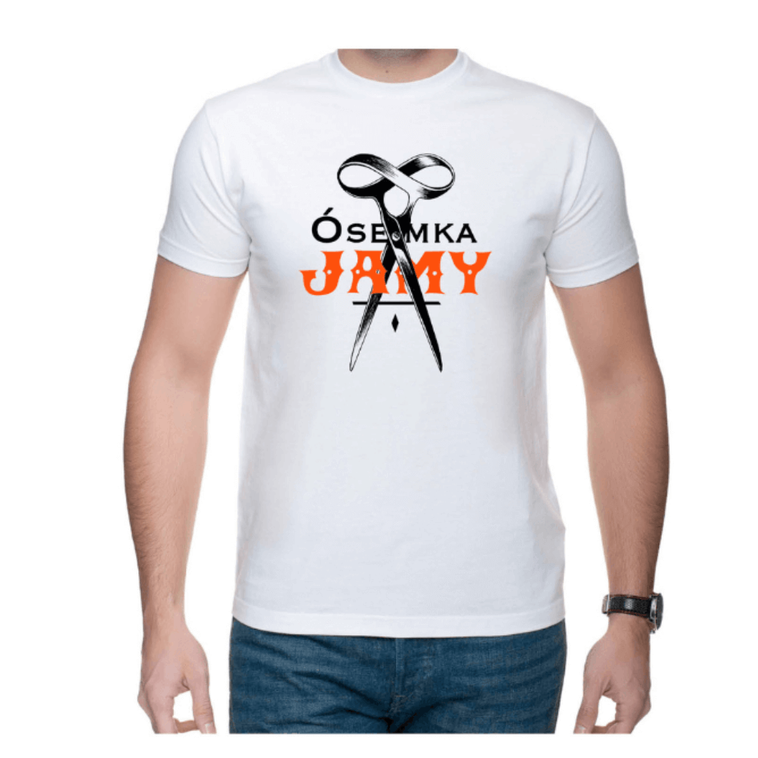 Biała z kolorowym nadrukiem z przodu i czarnym logo Adam Szulc Barber na karku.