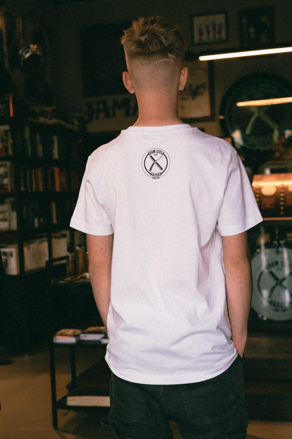 Biała z kolorowym nadrukiem z przodu i czarnym logo Adam Szulc Barber na karku.