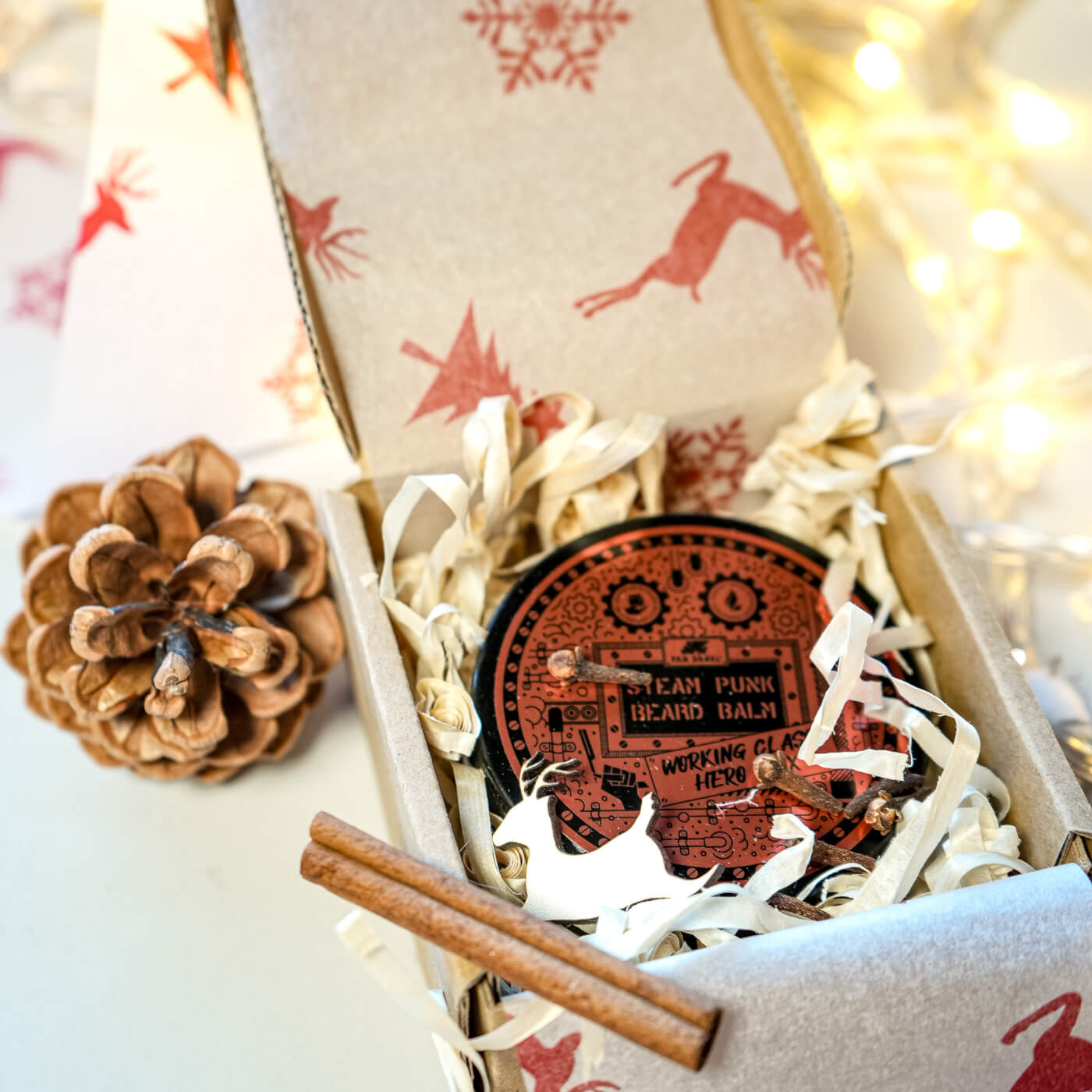 Prezent w boxie świątecznym nie tylko elegancko wygląda, ale również pięknie pachnie. Jest to zasługa wsypanych do środka dodatków takich jak goździki, cynamon, anyż, szyszki czy suszone pomarańcze. W wigilijny wieczór, po otwarciu pudełka zapach wszystkich przypraw będzie unosić się w powietrzu tworząc niesamowity świąteczny klimat. Wszystkie produkty w zestawie utrzymane są w zimowej, kraftowej stylistyce.
