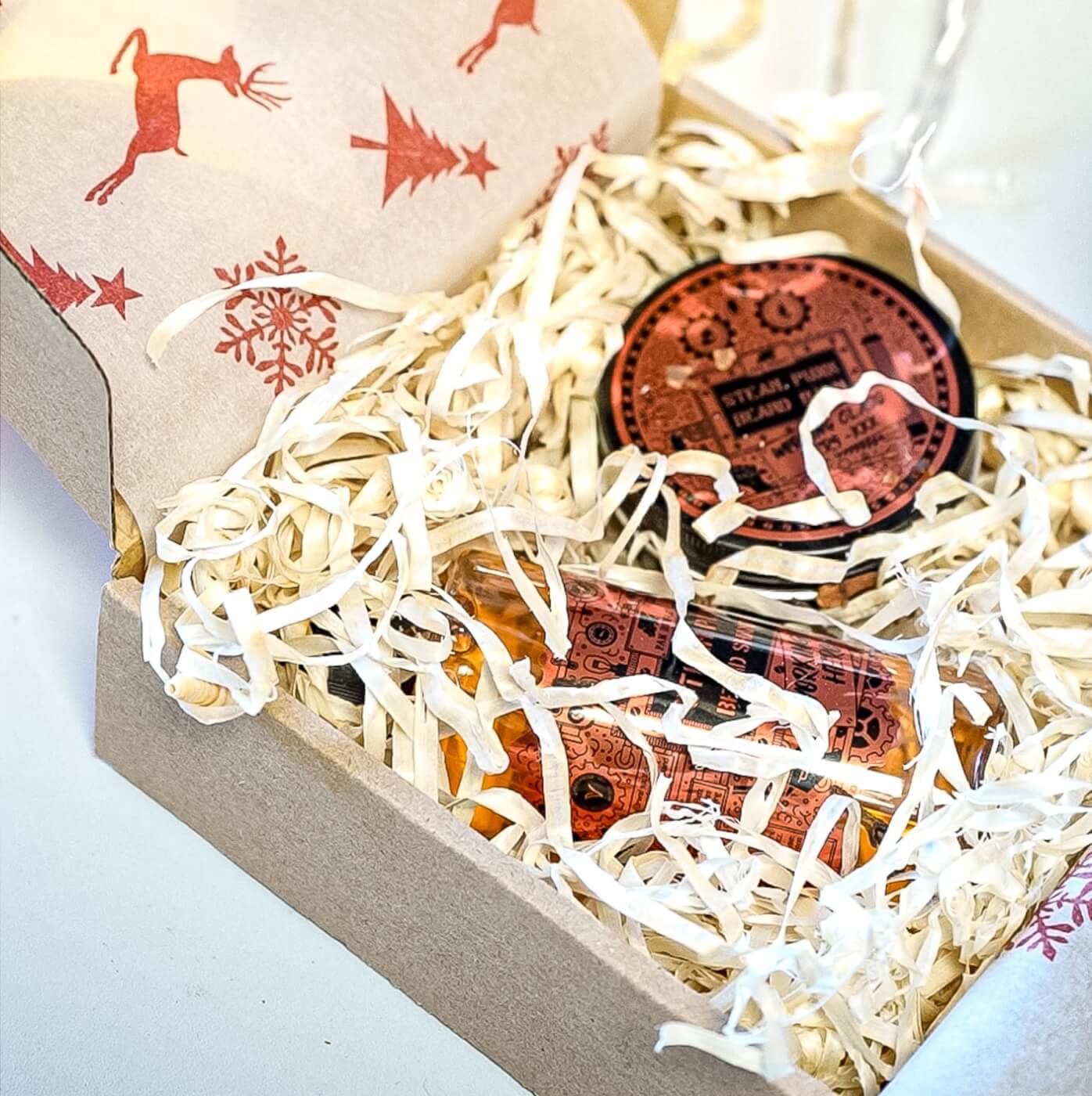 Prezent w boxie świątecznym nie tylko elegancko wygląda, ale również pięknie pachnie. Jest to zasługa wsypanych do środka dodatków takich jak goździki, cynamon, anyż, szyszki czy suszone pomarańcze. W wigilijny wieczór, po otwarciu pudełka zapach wszystkich przypraw będzie unosić się w powietrzu tworząc niesamowity świąteczny klimat. Wszystkie produkty w zestawie utrzymane są w zimowej, kraftowej stylistyce.
