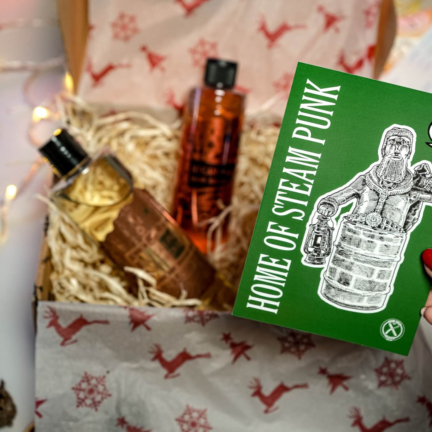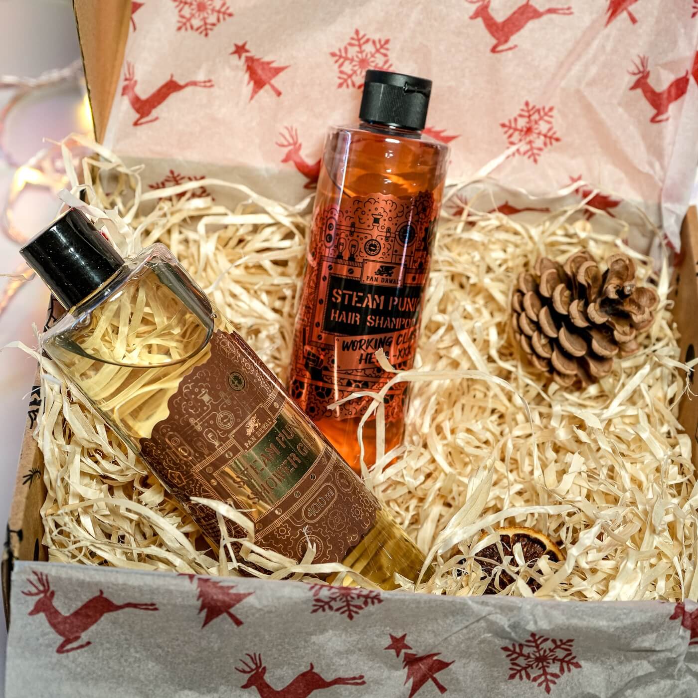 ✔ produkty otulamy bibułą ze świątecznym nadrukiem