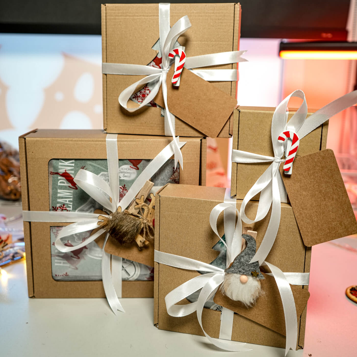 ✔ produkty otulamy bibułą ze świątecznym nadrukiem